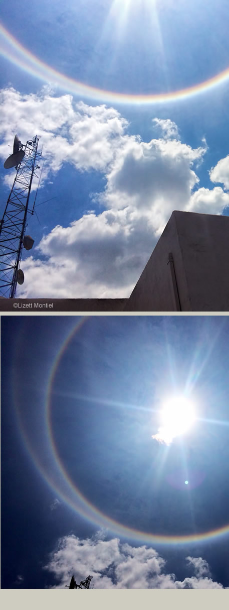 | Rare High Sun Halos, Laredo, Texas Pictures by Araceli Cadena and Lizett Montiel of halos in miles high icy cirrus on May 29, 2014. Thanks to Richard Berler �Heatwave� Berler, Chief Meteorologist at KGNS TV who alerted OPOD. Copyright of all images is with the photographers |