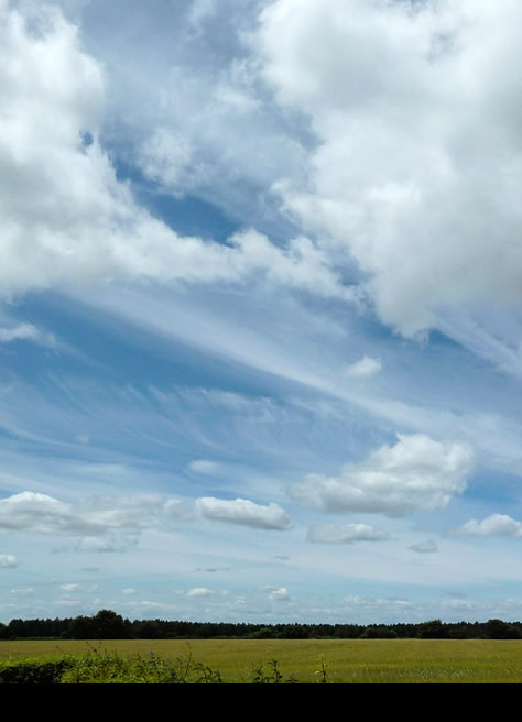 | Circumzenithal Arc A capture by Jane Moore-Taylor from the Chilterns, England on 25th June ’14. Over the past few days a northern air stream has rendered English skies the clearest blue with little extinction near to the horizon, a blue deepened by contrast with low cumulus fractus Humidity has been just right to spread contrails into wide long-lasting cirrus ribbons that as the day progressed thickened and spread more. This cirrus has so far failed to show a much sought circumhorizon arc in the narrow time slot available around noon near the solstice. However, an equally pure coloured circumzenithal arc is here an ample compensation. All images ©Jane Moore-Taylor, shown with permission |