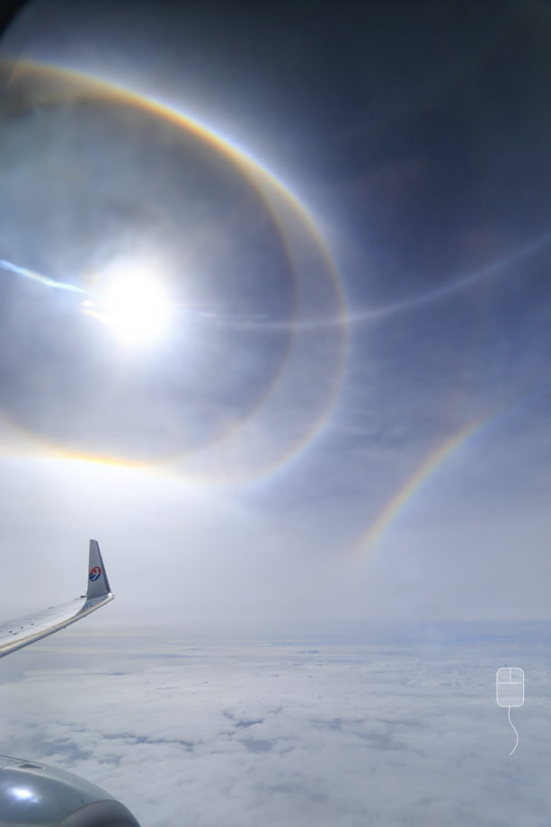 | Another image showing the lower sunvex Parry arc just above the aircraft's winglet. Mouse over for a view where the halos are enhanced by levels shift and unsharp masking. This is more aesthetic but less effective than colour subtraction. On this image the latter shows the other Parry arcs and the upper and lower Wegener arcs. Note the parhelion. It was absent in the top image. Crystal populations change quickly at 500 mph! |