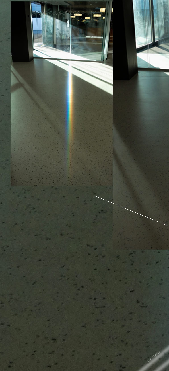 Sunlight floods into an office at Basel, Switzerland. The chamfered glass door edge acts as a prism to mimic Newton’s experiments in the late 1660s on the ‘celebrated phenomenon of colours’. White light disperses into its component colours. Images by Eric Guicherit. ©Eric Guicherit, shown with permission |