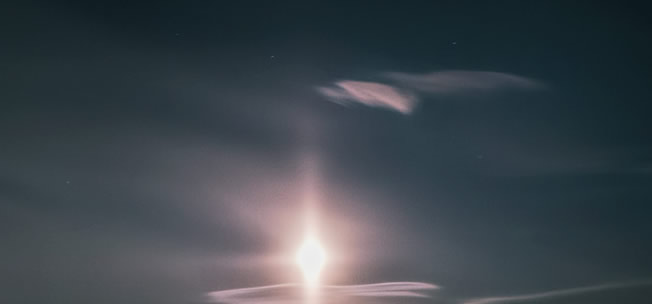 ~ Images by Okcana Gracheva at Aykhal, a diamond mining centre in Yakutia. Millions of low level horizontal plate crystals drifting in the freezing air reflect ground lights to produce the illusion of upward pillars of light. Similar plates, probably in high cirrus, generate the moondogs, a faint 22° halo and a hint of parhelic circle.