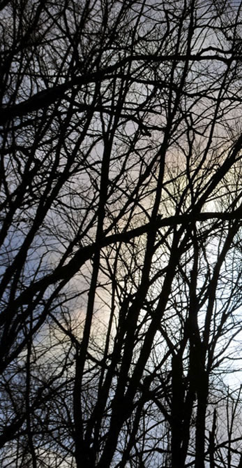 A corona is a series of multi-coloured rings surrounding a bright central aureole centred on the sun or moon. It is typically a few degrees across. Stretch out your arm and the corona will be the width or less of a clenched hand. Small water droplets in thin cloud or mist produce it. They individually diffract light to produce the large interference pattern in the sky that we call a corona.