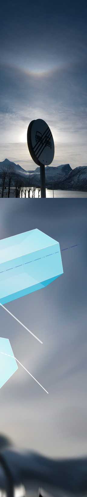 | Lone Halo, Norway ~ Upper tangent arc imaged by Lars Brubæk February 25, 2010. The location is Ytre (outer) Bogge We usually see a 'gull wing' shaped upper tangent arc atop a 22° halo. However, the two halos have separate origins. The upper tangent arc is the glints of sunlight passing through hexagonal column ice crystals oriented by aerodynamic drag forces to have their long 'c' axes nearly horizontal. The better the crystal alignments, the sharper is the halo. The crystals can take all rotational positions about the long axis although they do not necessarily individually 'spin'. The rays pass between two upper prism faces inclined 60° to each other. The plane of the ray can be skewed relative to the axis. Red light is refracted less strongly than blue giving the halo a red fringe on its sunward edge. Equivalent rays passing between lower prism faces give a 'lower tangent arc' beneath the sun. When the sun climbs above 29° the upper and lower tangent arcs join to form a circumscribed halo. |