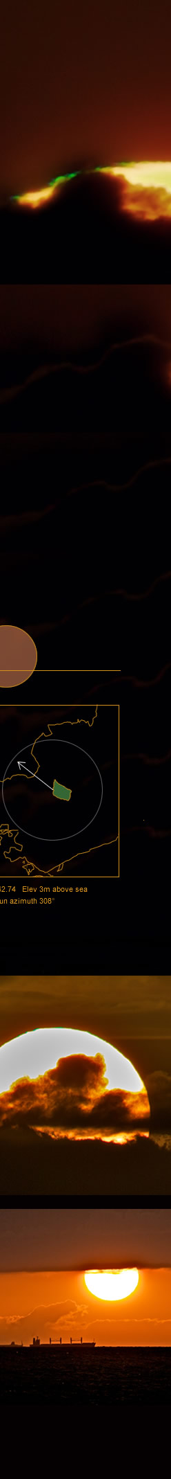 Cloud-top flashes are likely a form of mock-mirage flash but they are rather rarer and are not properly understood. They seem to occur as rays from the sun’s upper limb just graze the top of a cloud bank. Jesper Grønne’s sequence shows this happening but, as often is the case, the green flashes do not seem to be exclusively where obscuration by the cloud top is starting. It may be, however, that some parts of cloud top are thin and not visible.