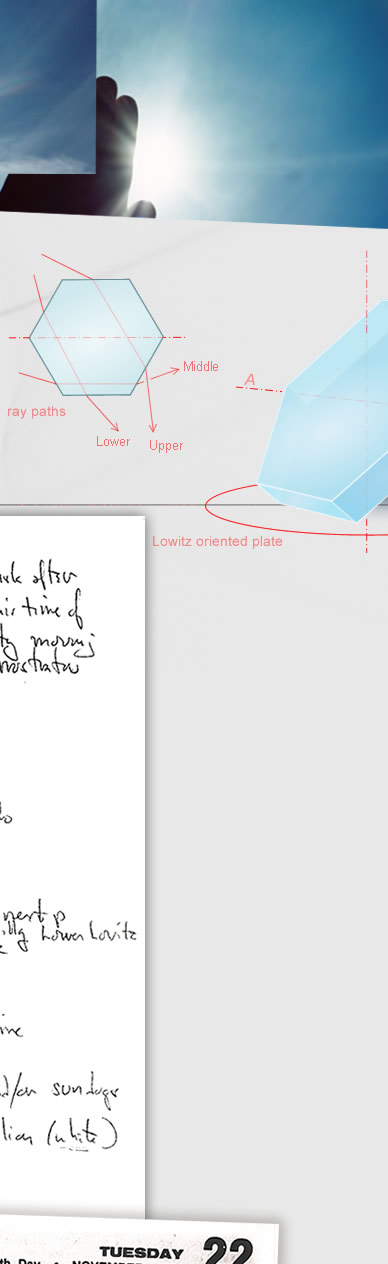 | 1988 Lowitz Pictures Robert Gorkin meticulously recorded this ice halo display at Dover, Delaware, USA on Tuesday, November 22, 1988 13:15 to 14:00 EST. At left is one of 24 images recorded on two film rolls. His images are the earliest known ones of the three Lowitz arcs. Lowitz arcs have generated more controversy than any other halo. One arc was first sketched by Tobias Lowitz in St Petersburg 1790. Subsequent sightings were sparse indeed. The absence of photographs, even from superb halo locations like the Arctic and Antarctic, led to serious doubts about their existence through to the late 1990s and in some cases beyond. That did not stop theoretical investigation. It was established that they might be formed by plate crystals with a rotation axis parallel to a large hexagonal face. In 1979 Mueller, Greenler and Mallmann used the new tool of computer ray tracing to predict that crystals with a 'Lowitz axis' passing across a crystal diagonal would produce three types of Lowitz arc, an 'upper', 'lower' and 'middle'. Gorkin's 1988 images are perhaps the earliest that show them - although the middle arc is, as always, rather elusive. In the top image (#16) the lower Lowitz arc, the only one recorded by Lowitz, stretches down from the sundog towards the 22º halo. A fainter arc extends upwards to the 22º halo, the predicted upper arc. In places the two arcs overlay the 22º halo and their presence, as here, is often best indicted by weakness of the 22º halo opposite the parhelion. There is possibly also the third predicted Lowitz arc, the middle, extending nearly vertically through the parhelion. This is slightly more evident in the stack of three images at left. Mouse over to see the matching ray tracing. When the sun is less than around 30° high the best place to search for an upper Lowitz arc is above the 22º halo rather than near the sundogs. There, it crosses the upper tangent arc and becomes tangent to the Parry arc. Gorkin's images below (#19,18 ) show it clearly. They also show the arcs near each parhelion. All images ©Robert Gorkin, shown with permission. |