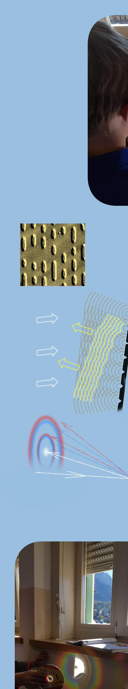 | "During an English lesson on colors, a student played with the CD that came with the English book, creating a circular rainbow around its sun reflection. I too like to create rainbows with a CD, but I never got colors so clear and well distributed. The game involved other children too and as you can see in the pictures, they also created shadows within the color projection. Then, of course, we continued with the lesson with CDs that were still all working." |
