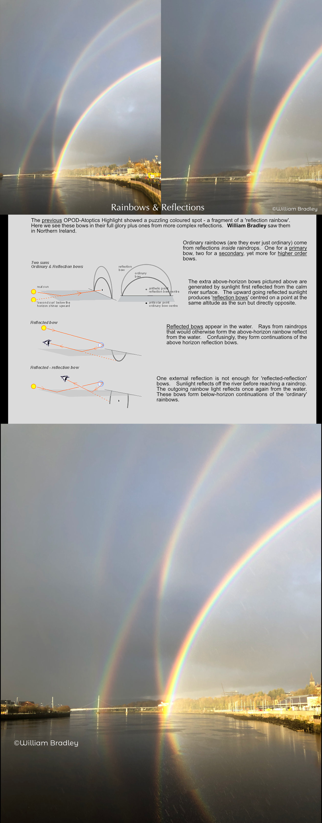 The previous OPOD-Atoptics Highlight showed a puzzling coloured spot - a fragment of a 'reflection rainbow'. Here we see these bows in their full glory plus ones from more complex reflections. William Bradley saw them in Northern Ireland.?