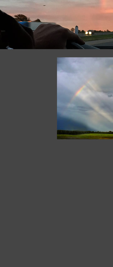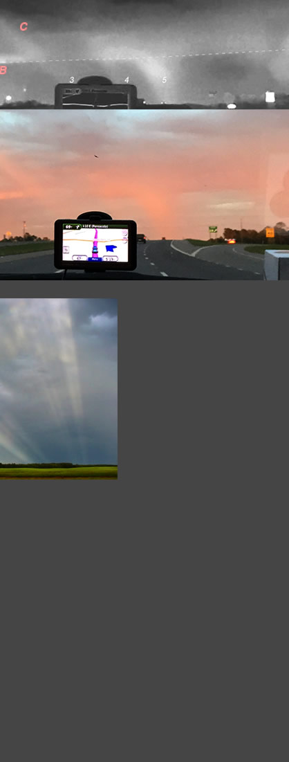 From the image times and the exact vehicle position from GPS (plus comparing an image with Google Earth) we found that the sun was low on the horizon, only 0.2� high in the WNW. The red sunset glow is visible in the car side mirror. The sunset rays illuminate the highway signs with red light.