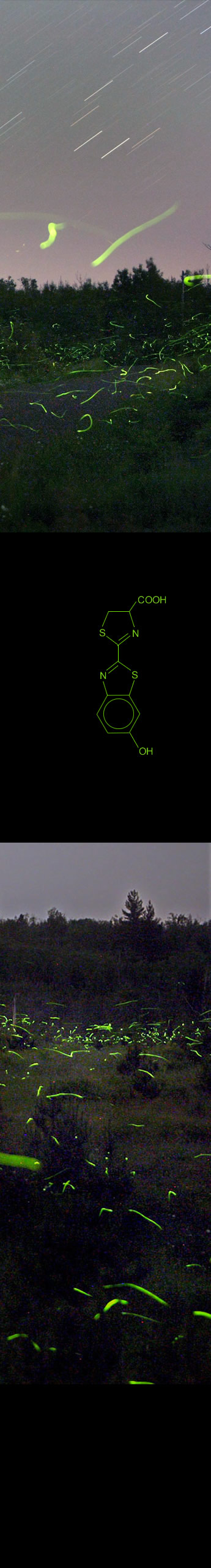 A molecule, called generically a luciferin, is acted on by an enzyme ( generically a luciferase). Oxygen, magnesium ions and life’s ubiquitous energy transfer molecule ATP (adenosine triphosphate) are necessary too. The reactions take place at a specific site on the surface of the large enzyme molecule that act as a catalyst. Luciferin reacts with ATP. Then the product reacts with oxygen to form a compound (dioxetanone) with a peroxide ring. The unstable peroxide splits off carbon dioxide leaving an electronically excited oxyluciferin. That in turn emits the photon we see.